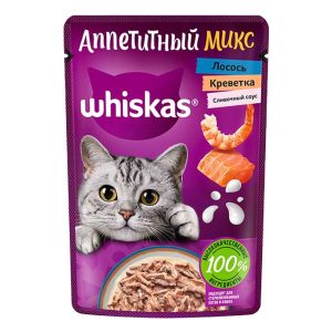 پوچ گربه ویسکاس با طعم ماهی سالمون و میگو Whiskas Salmon & shrimps in cream sauce وزن 75 گرم