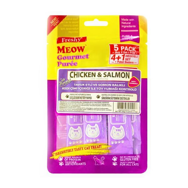 بستنی گربه ضد گلوله مویی با طعم مرغ و ماهی سالمون فرشی Freshy Puree Chicken & Salmon بسته 5 عددی