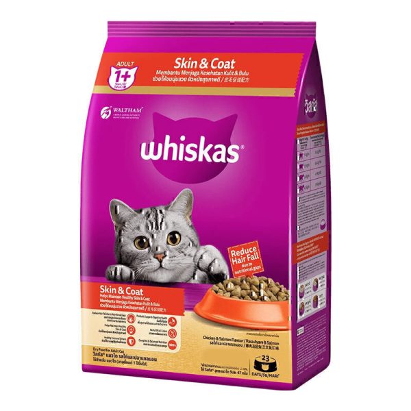 غذای خشک گربه تقویت پوست و مو ویسکاس با طعم مرغ و ماهی سالمون Whiskas Skin and Coat وزن 450 گرم