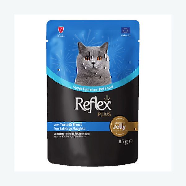 پوچ گربه رفلکس پلاس با طعم ماهی تن و قزل‌آلا در ژله Reflex Plus Chunks In Jelly With Tuna & Trout وزن 85 گرم