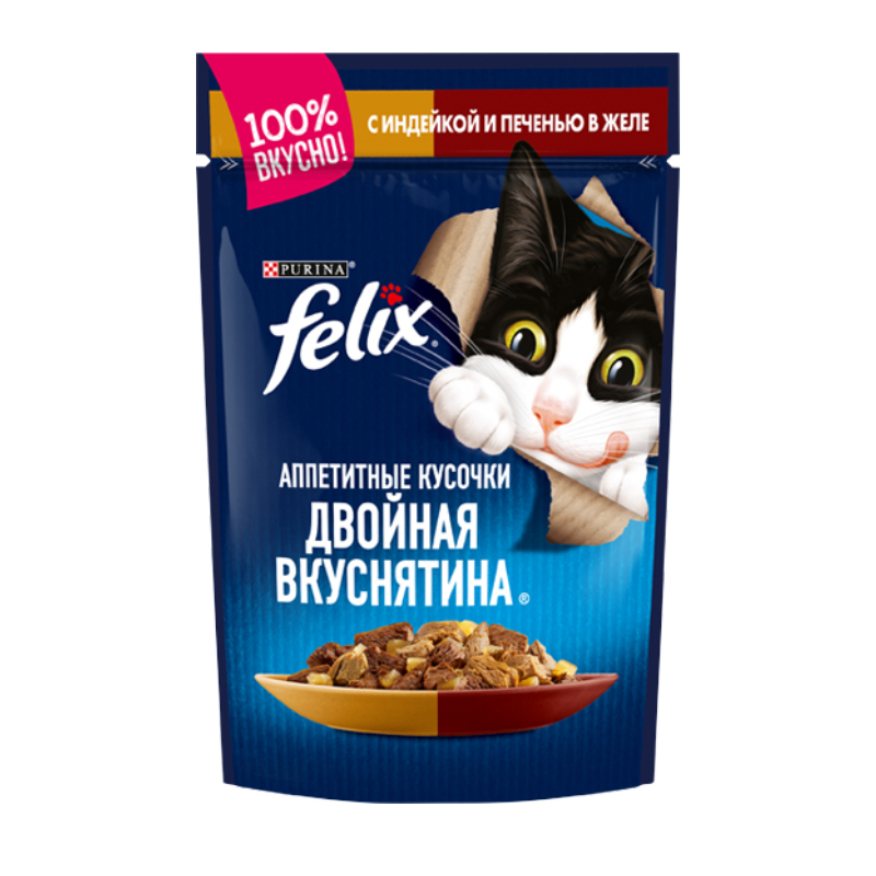 پوچ گربه فلیکس با طعم بوقلمون و جگر Felix Turkey & Liver وزن 75 گرم