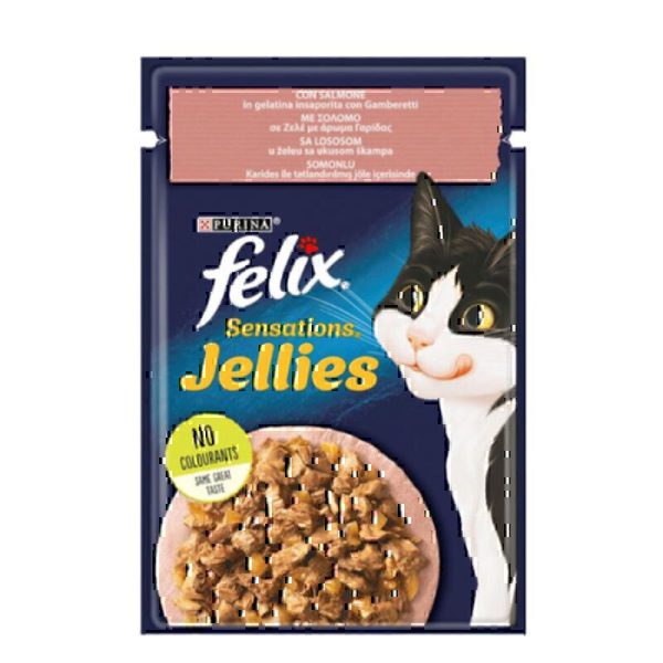 پوچ گربه فلیکس با طعم ماهی سالمون و میگو در ژله Felix Sensation Salmon in Shrimp flavored Jelly وزن 85 گرم
