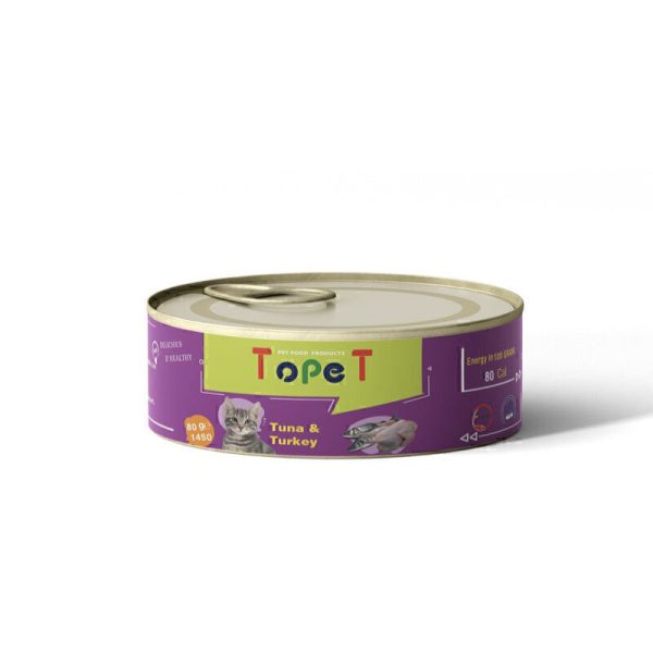 کنسرو غذای گربه تاپت با طعم گوشت ماهی تن و بوقلمون Topet Natural With Tuna & Turkey وزن 80 گرم