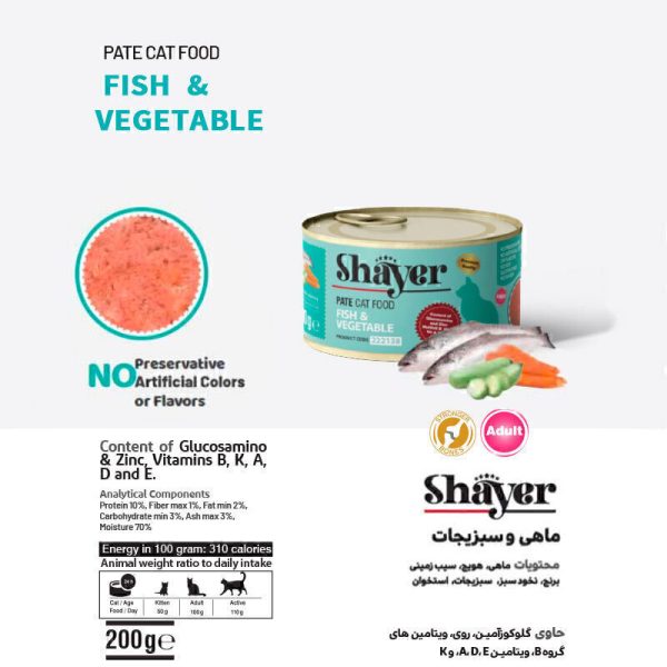 کنسرو غذای گربه پته با طعم ماهی و سبزیجات شایر Shayer Pate Cat Food Fish & Vegetables وزن 200 گرم